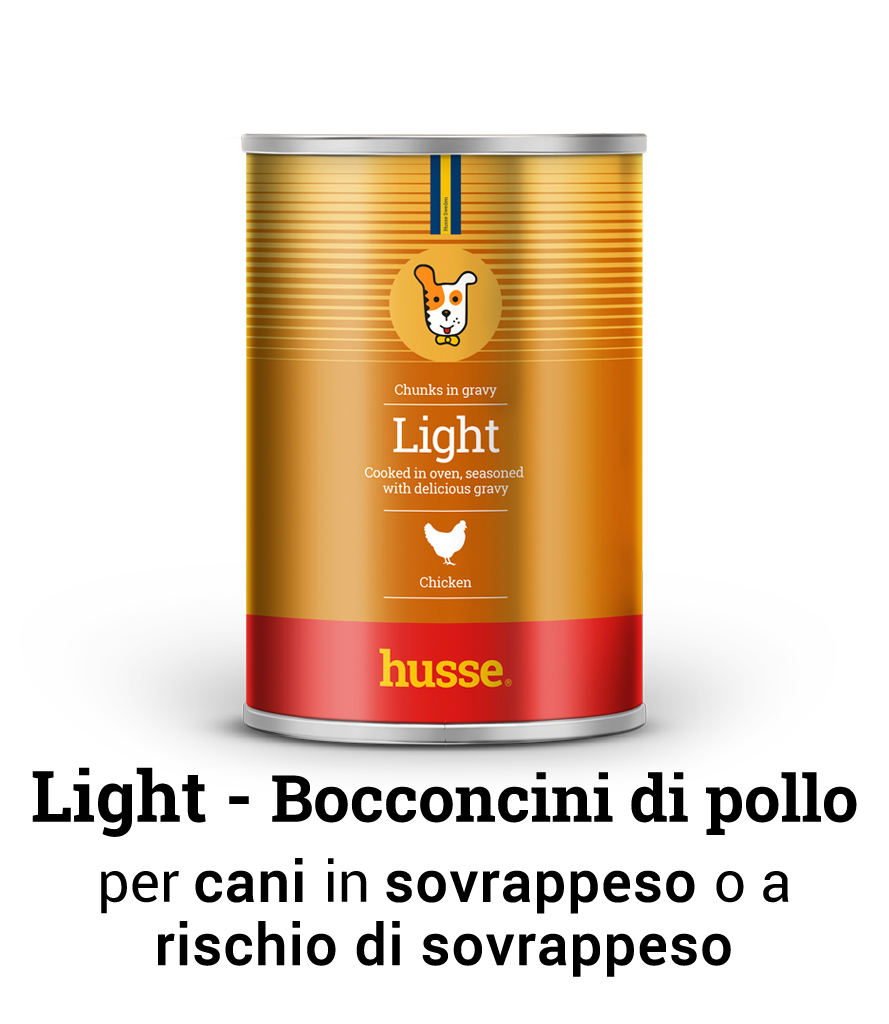 Per i cani in sovrappeso o a rischio di sovrappeso Husse ha realizzato anche alimenti umidi appositamente studiati per mantenere in forma il tuo amico a quattro zampe: