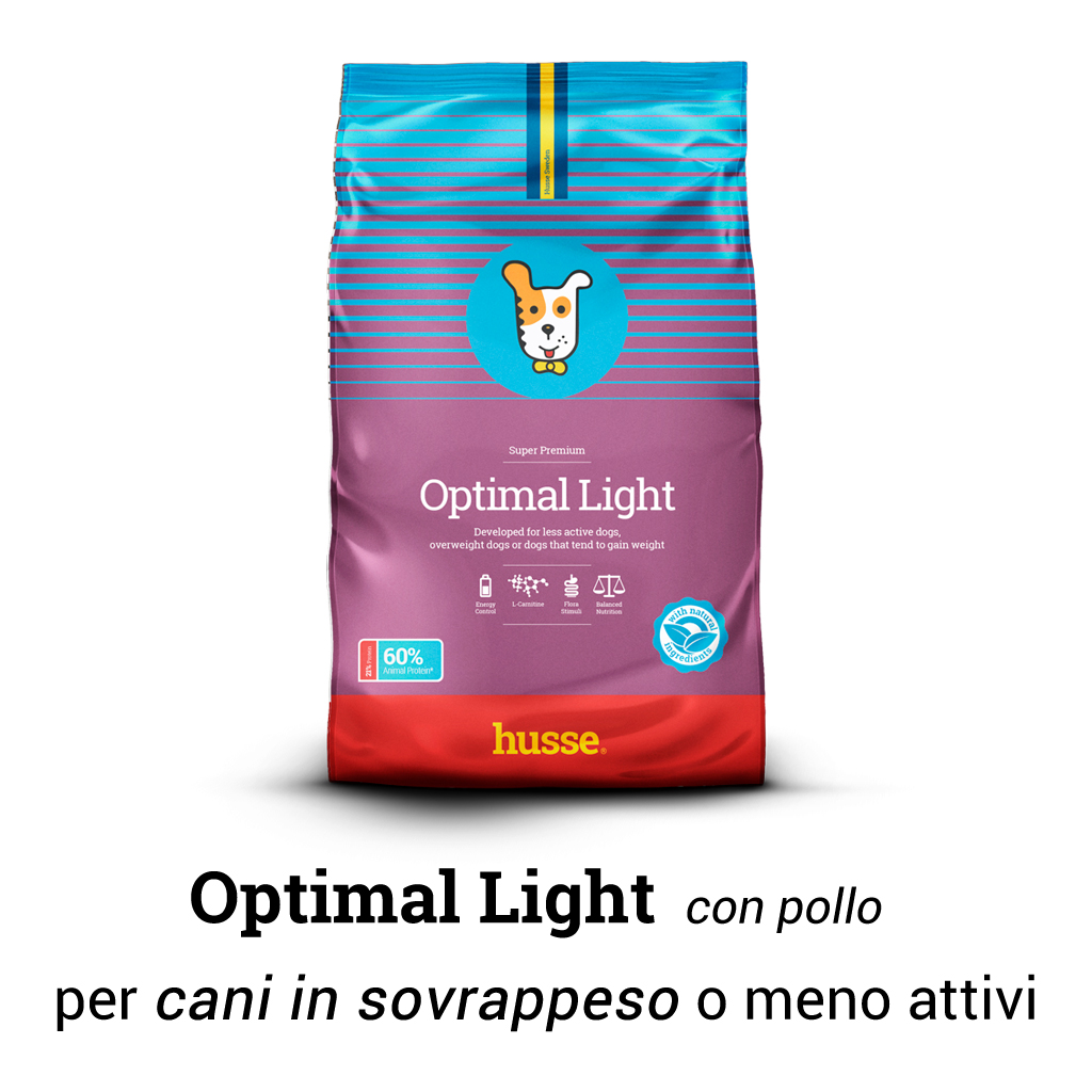 Optimal Light di Husse contiene ingredienti accuratamente selezionati con alto valore nutritivo e basso contenuto di grassi. Inoltre è ricco di fibre che favoriscono la sensazione di sazietà e consentono di ridurre la razione giornaliera per un limitato apporto energetico.