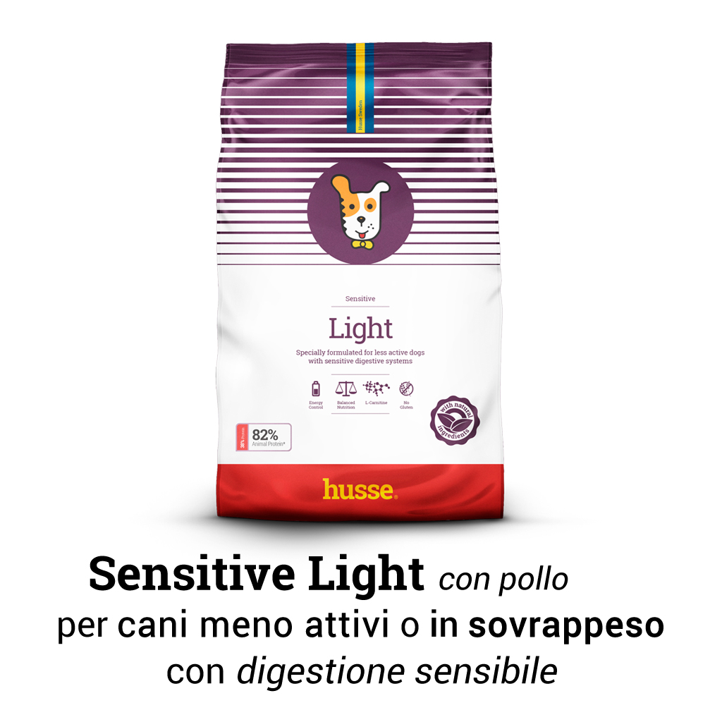 Sensitive Light per cani meno attivi o in sovrappeso, è altamente digeribile grazie agli ingredienti accuratamente selezionati, a base di pollo e riso.