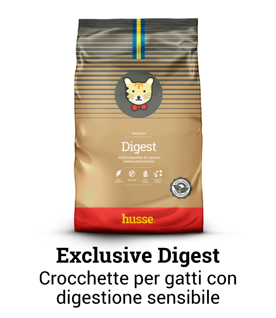 Exclusive Digest: pensato per gatti con problemi di allergie o digestione sensibile, aiuta il tuo micio a rimanere in linea e a sentirsi in forma.