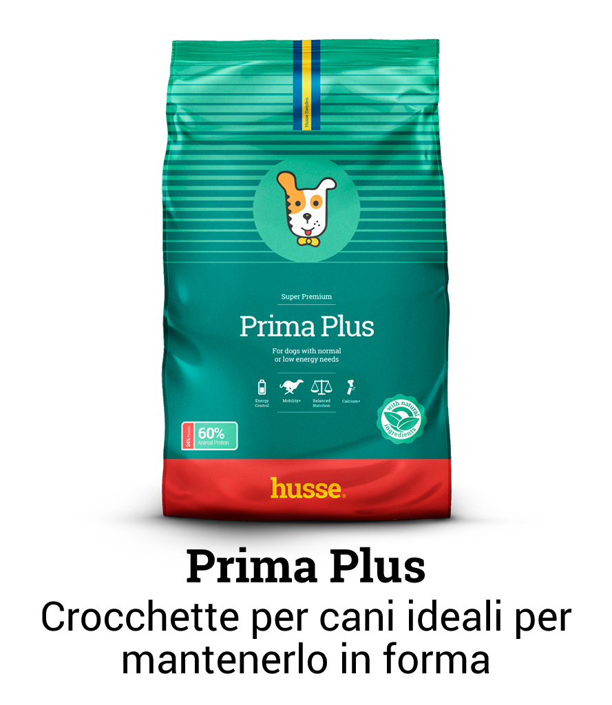 Prima Plus: perfetto per cani con fabbisogno energetico normale. Ha un tenore in massa grassa ridotto ed è dunque ideale per mantenere il tuo cane in perfetta forma e per prevenirne l’obesità.