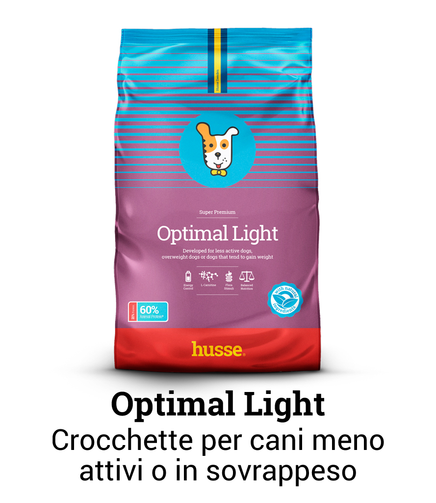 Light Optimal: formulato con ingredienti accuratamente selezionati ad elevato contenuto nutrizionale ma con meno grassi per un miglior controllo del peso del cane.