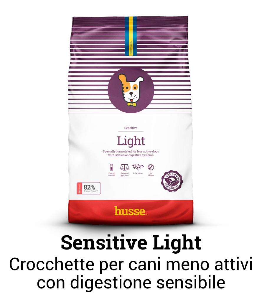Light Sensitive: adatto a cani con digestione sensibile, è ideale per soddisfare il fabbisogno nutrizionale dei cani meno attivi, in sovrappeso o che tendono a prendere peso velocemente.