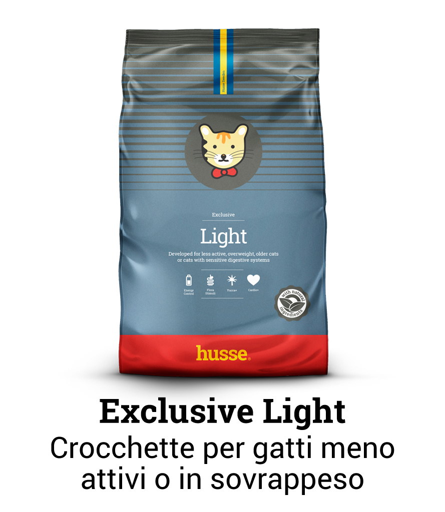 Exclusvie Light: indicato per gatti meno attivi, in sovrappeso, anziani o con sistema digestivo sensibile. Grazie al suo equilibrio ottimale di sostanze nutritive, soddisfa tutte le esigenze del vostro gatto, permettendogli di rimanere in forma e di mantenere cute e pelo in salute.