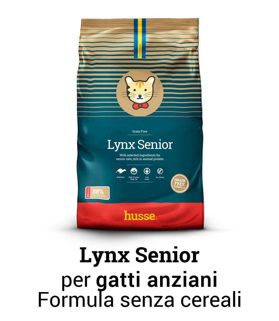 Lynx Senior - formula senza cereali sviluppato per soddisfare i bisogni nutrizionali dei gatti anziani. Un basso contenuto di grassi aiuta a controllare il loro peso corporeo.