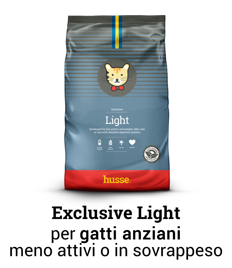 Exclusive Light - alimento completo per gatti meno attivi, in sovrappeso, anziani o con sistema digestivo sensibile. Soddisfa tutte le esigenze del vostro gatto, permettendogli di rimanere in forma e di mantenere cute e pelo in salute.