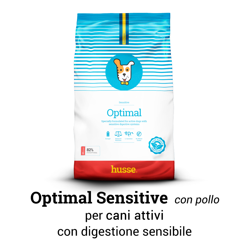 Optimal Sensitive per cani attivi, a base di pollo. Non contiene glutine ed è dunque adatto a cani con sistema digerente sensibile e problemi di allergie. L'elevato tenore in massa grassa è appositamente pensato per soddisfare il maggiore fabbisogno energetico dei cani attivi.