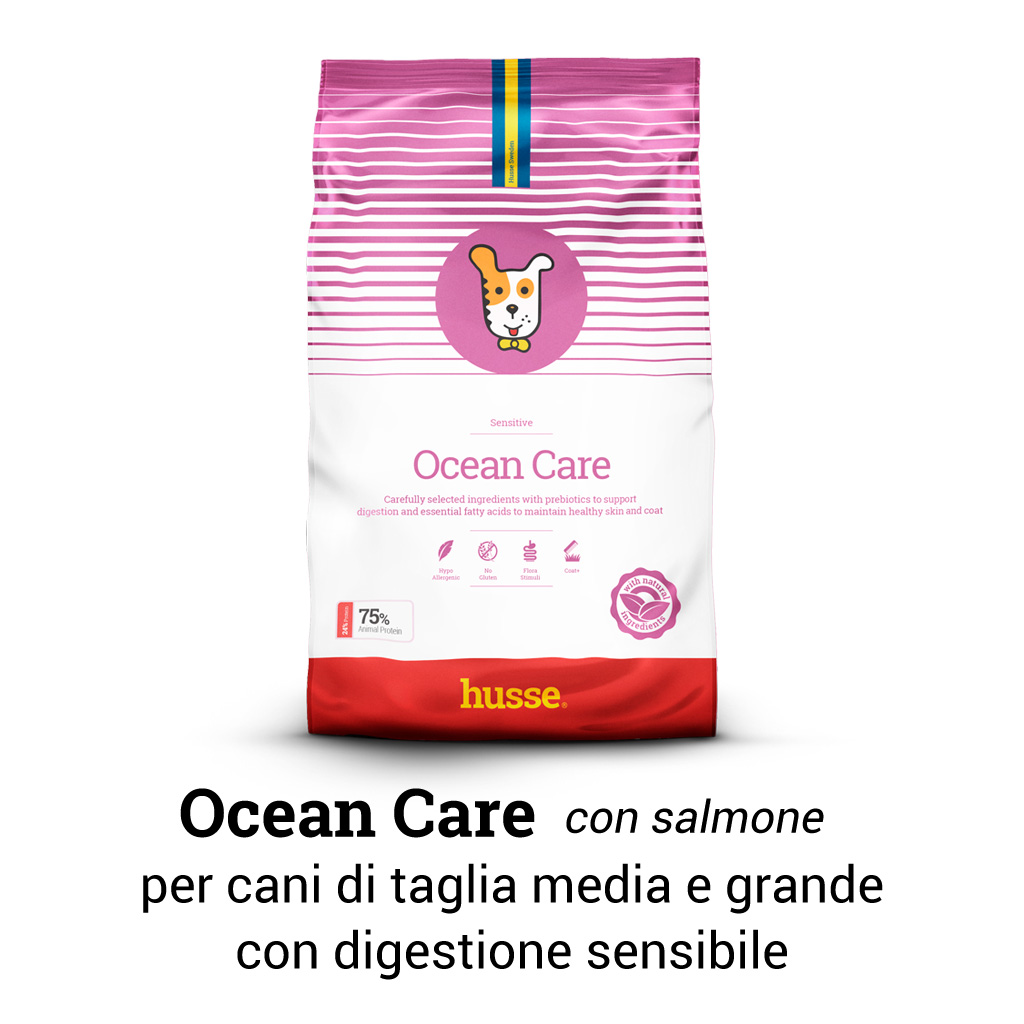 Ocean Care per cani di taglia media e grande, contiene salmone come unica fonte proteica. Perfetto per cani che soffrono di intolleranza al glutine o allergie alle proteine ma tollerano bene il salmone.