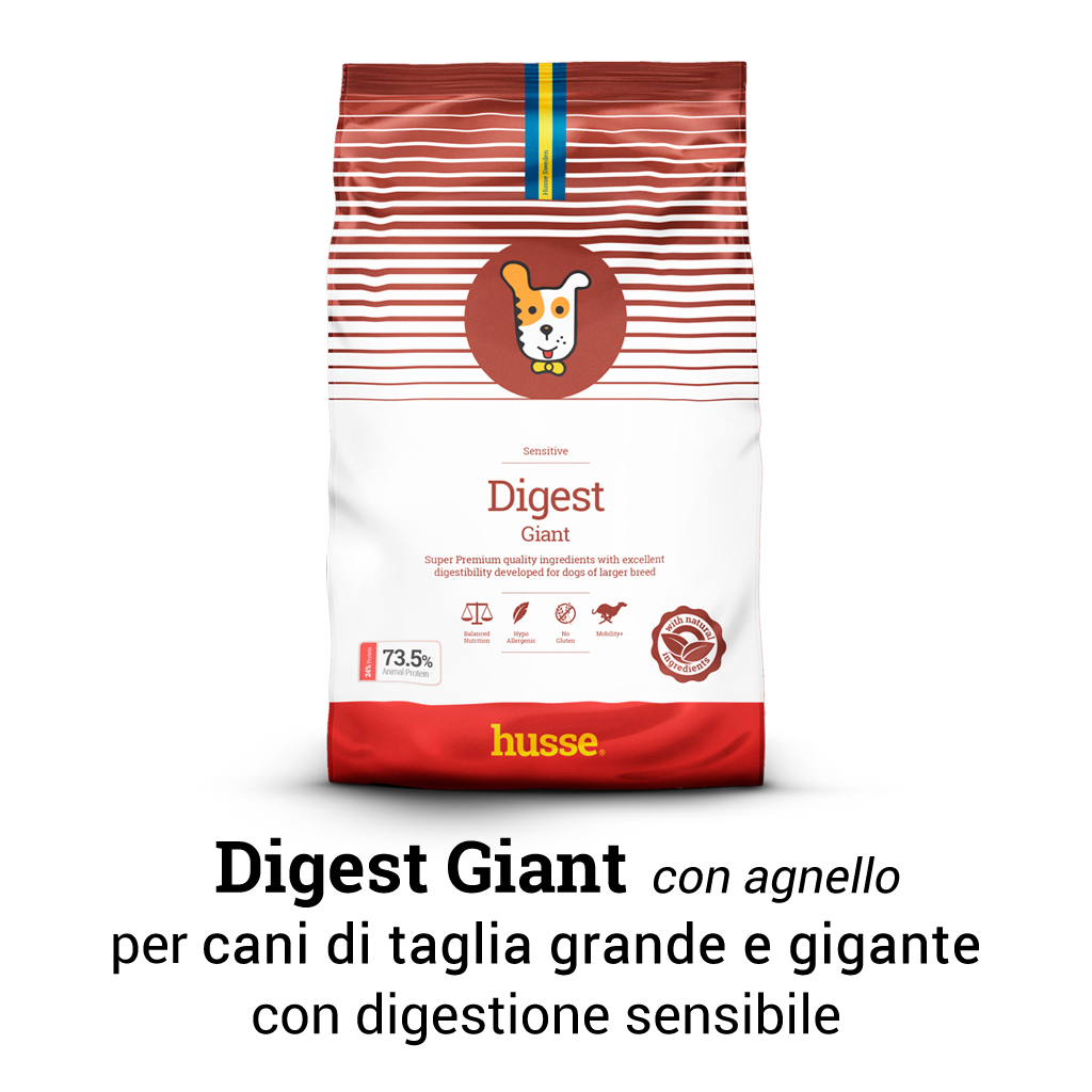 Digest Giant per cani di taglia grande e gigante, contiene agnello come fonte proteica. L'aggiunta di condroitina e glucosamina supportano le articolazione mentre il contenuto ottimale taurina contribuisce a una migliore funzione cardiaca.