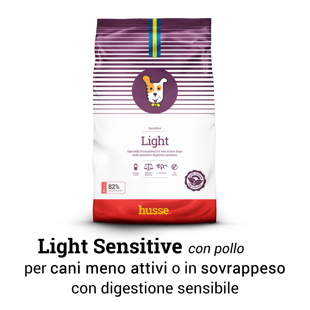 Light Sensitive per cani meno attivi o in sovrappeso, contiene pollo come fonte primaria di proteine. Particolarmente adatto anche per cani che soffrono di diabete.