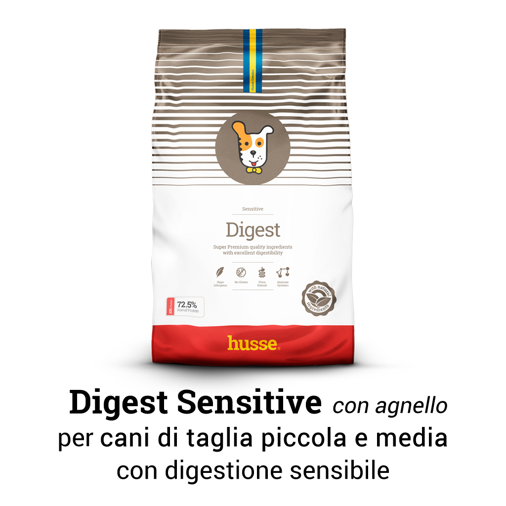 Husse offre una varietà di crocchette per cani adulti con sistema digerente sensibile realizzati con ingredienti che hanno meno probabilità di causare allergie rispetto ad altri alimenti.