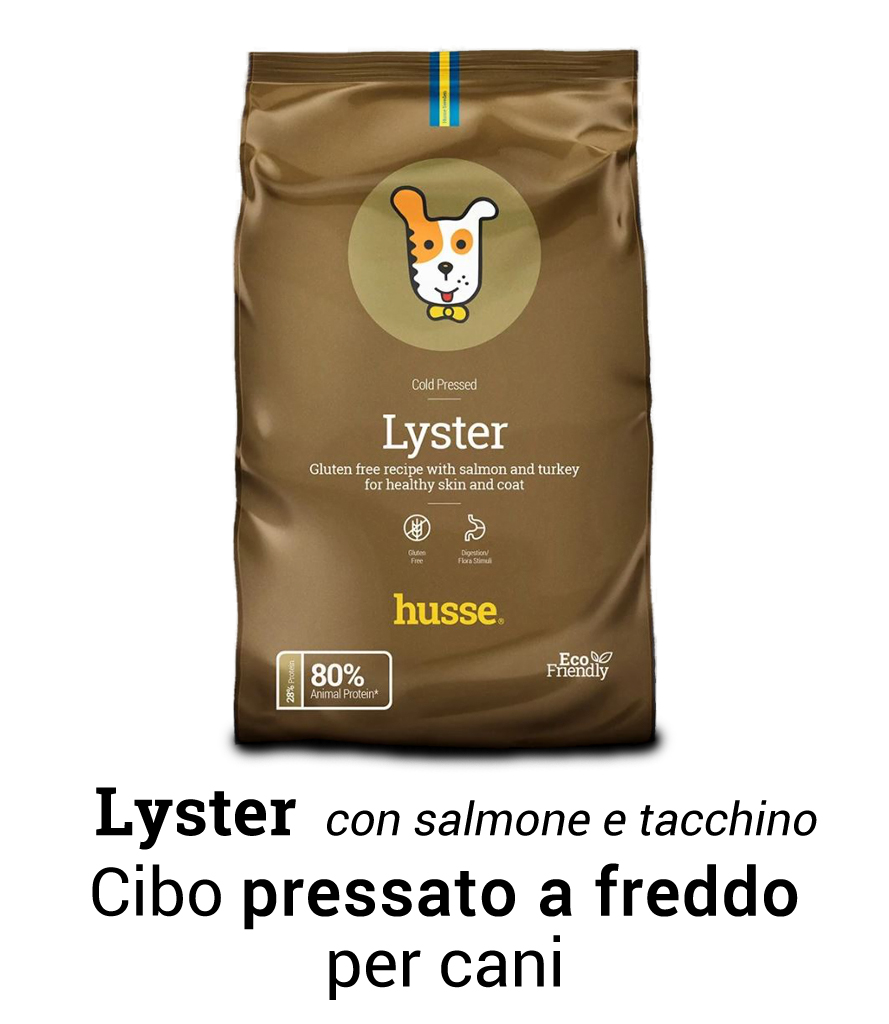 Lyster - con salmone e tacchino, è un cibo pressato a freddo senza glutine e altamente digeribile. Ideale per cani con digestione sensibile e contribuisce a mantenere in salute cute e pelo!