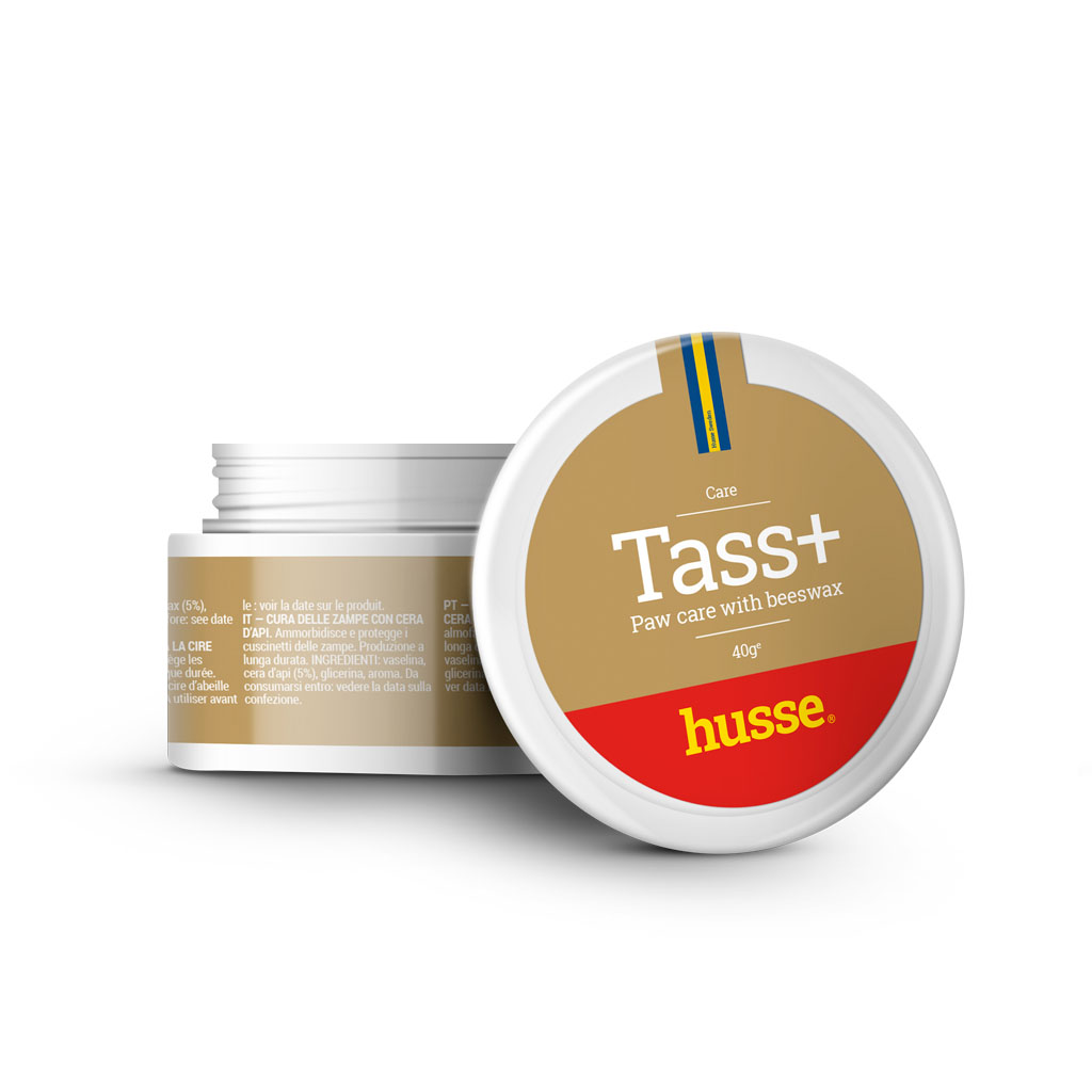 Husse consiglia un apposito balsamo con cera d'api Tass Plus che protegge e lenisce i cuscinetti delle zampe del tuo amico a 4 zampe: