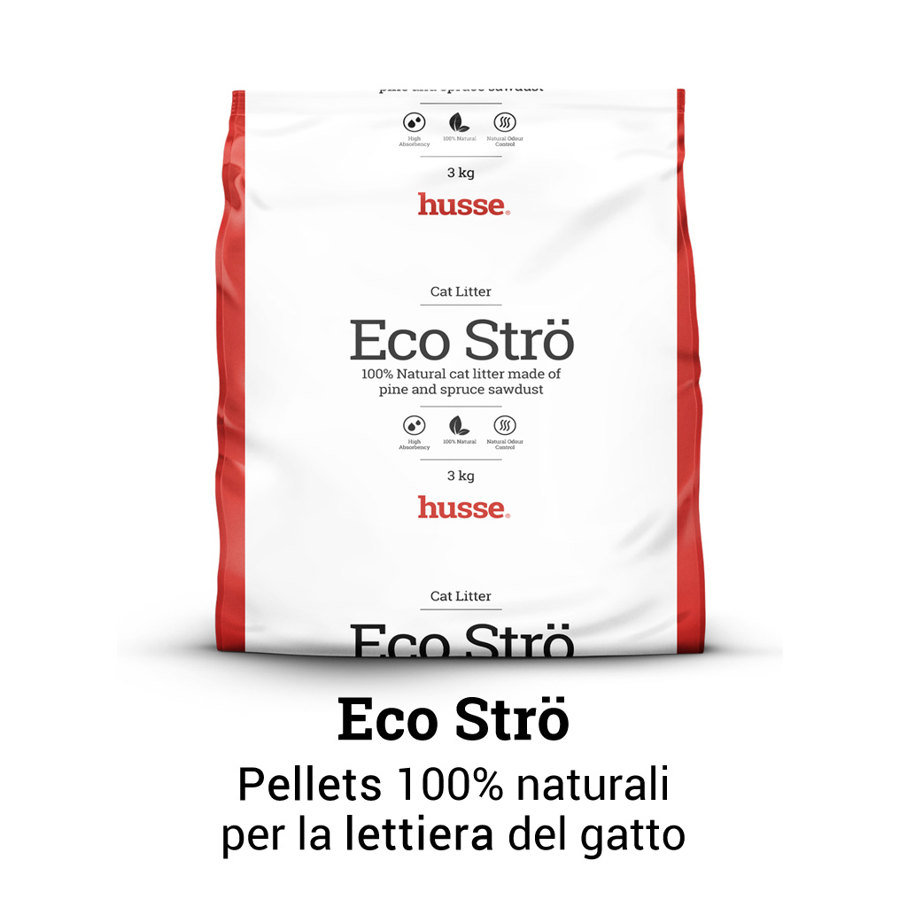 Husse ha studiato e creato un prodotto 100% ecologico, privo di odori sgradevoli e senza aggiunta di additivi nocivi: Eco Strö. Un sistema di lettiere innovativo, realizzato con segatura di pino e abete rosso proveniente da foreste svedesi di provenienza sostenibile.